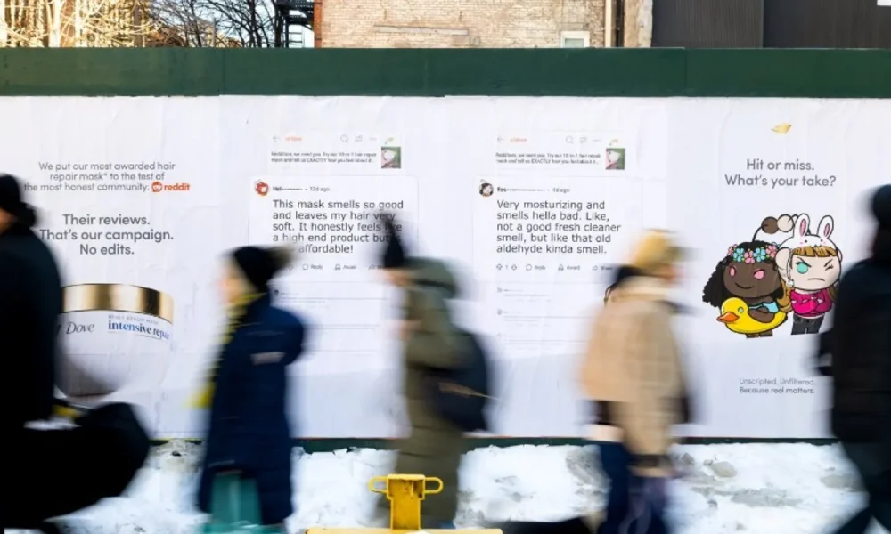 The "r/eal reviews" campaign is entered in New York City, specifically launching with a major high-traffic activation at Flatiron Plaza.