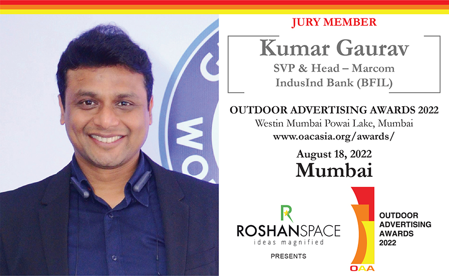 Kumar Gaurav, SVP & Head of Marketing Communications, IndusInd Bank Ltd (BFIL), joins the distinguished Jury for the Outdoor Advertising Awards 2022 contest.