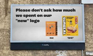 The creative features a series of large, minimalist billboards across multiple sites, each showcasing the cereal's "OLD" and "NEW" packaging side-by-side.