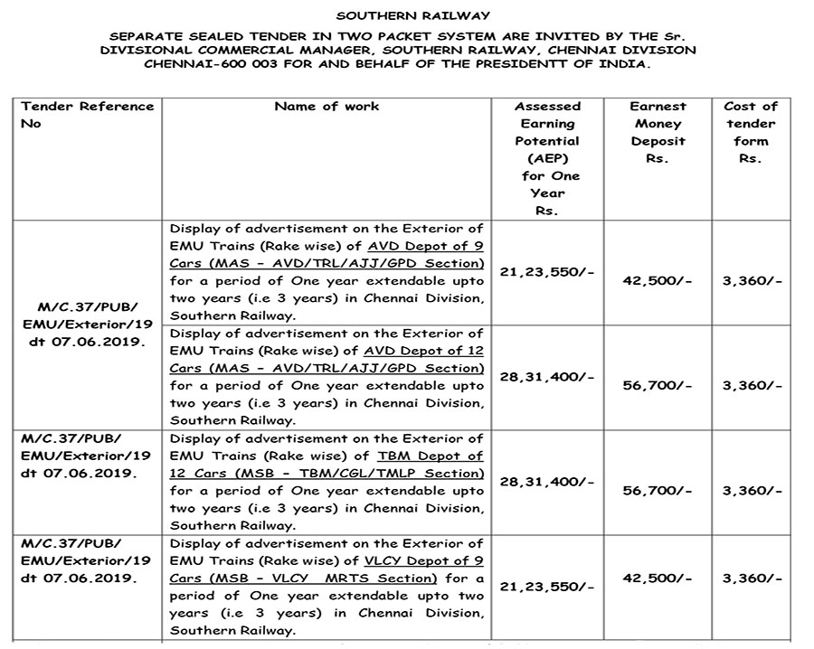 Southern Railway under the Indian Railways invites tender for the display of advertisement on the exterior EMU trains (rake wise) of Chennai division for the period of 1 year and further extendable for 2 years (i.e. total period of 3 years). The three routes of the EMU trains shall cover Chennai Central including the Avadi depot (covering Pattabiram, Tiruvallur, Arakonnam, Tiruttani, Gumidipoomdi and Sullurpetta) the Tambaram depot (covering Chengalpattu, Kanchipuram and Tirumalpur); and the Velacherry Depot (covering Chennai Beach).