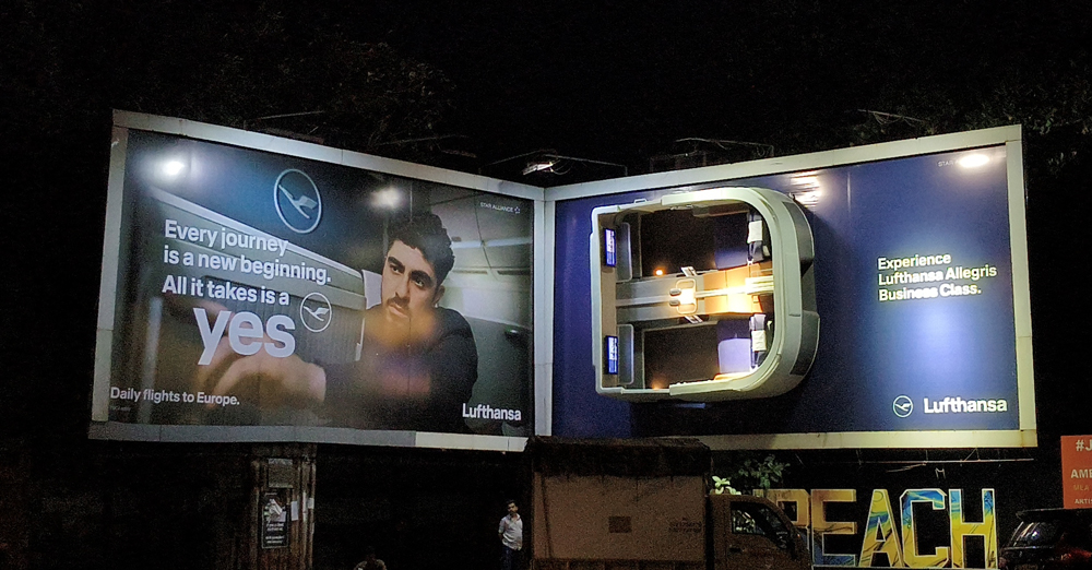 “Yes in the Sky” on the Mumbai Sea Link: Turning one of India’s most iconic landmarks into a canvas of aspiration, the Mumbai Sea Link became the centerpiece of the campaign. Through large-scale projection mapping, Lufthansa Airlines core message illuminated the bridge in the airline’s signature blue, transforming the city skyline into a striking beacon of new beginnings. Visible from miles away, the installation inspired Mumbaikars to envision their next European journey, reinforcing Lufthansa Airlines global outlook and premium stature.