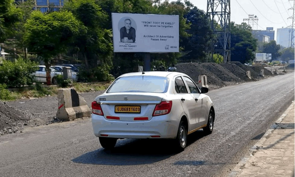 The hoarding describes him as an “Advertising world doyen” and expresses gratitude on behalf of the industry for his unmatched contribution. The stark and minimal design mirrors Pandey’s own communication ethos simple, powerful, and emotionally resonant.