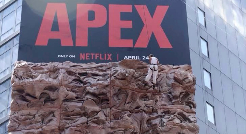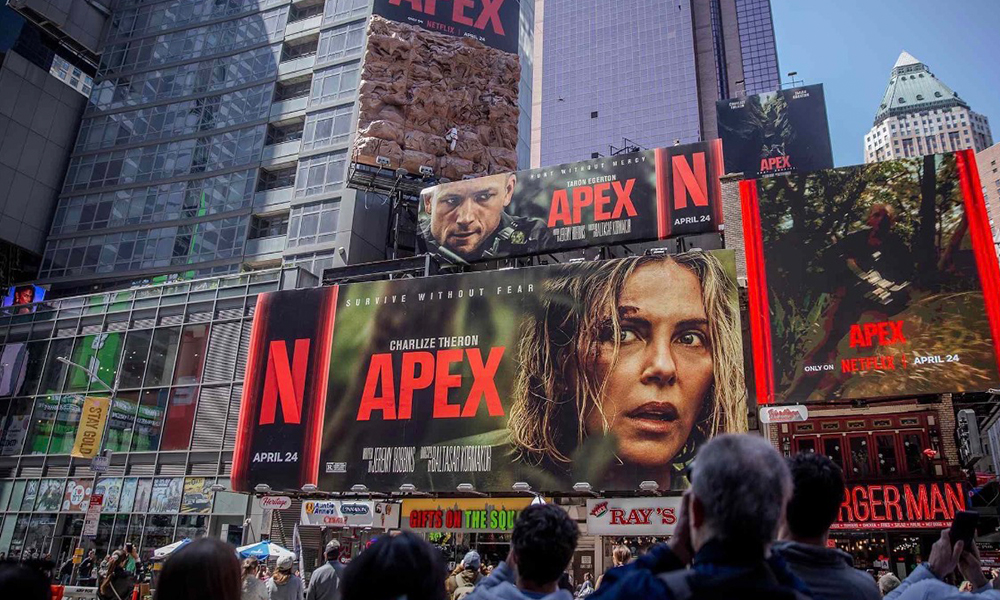 In a city known for spectacle, Netflix raised the bar for out-of-home with a high-adrenaline stunt to promote its survival thriller Apex. At the heart of Times Square, the campaign transformed a standard billboard into a live-action experience—featuring actress Charlize Theron scaling a towering rock-climbing installation built directly onto the media site.